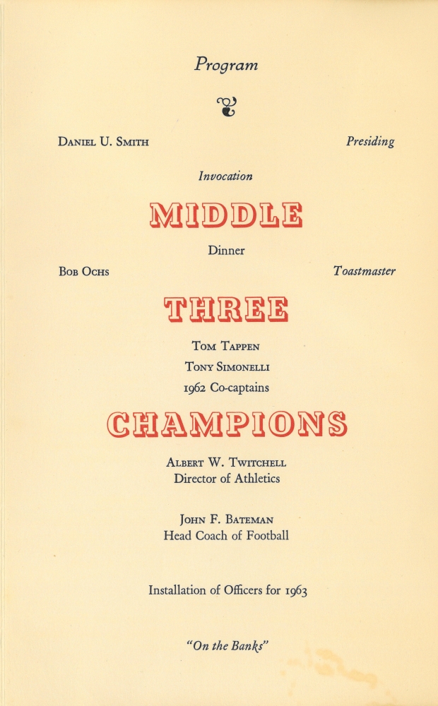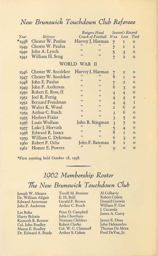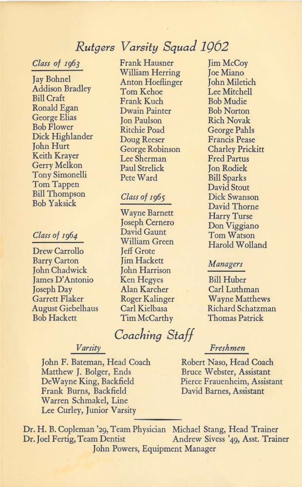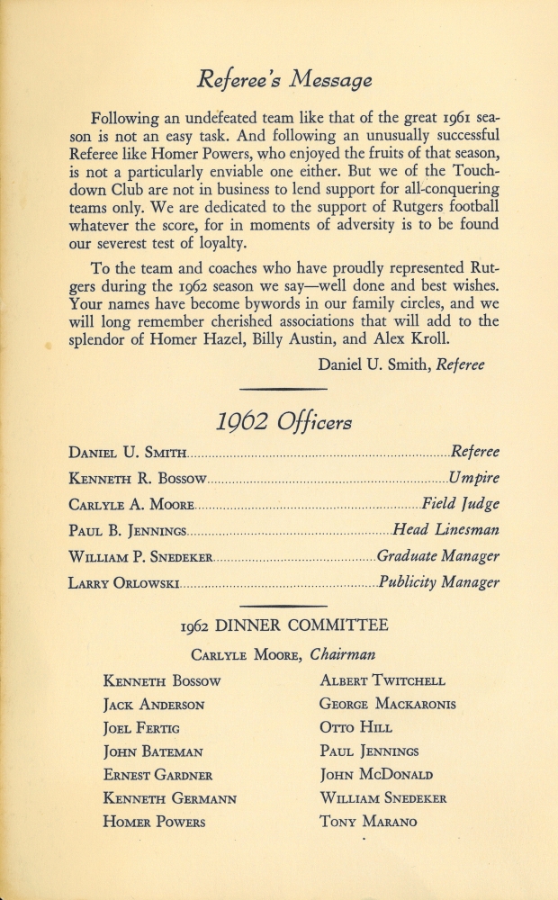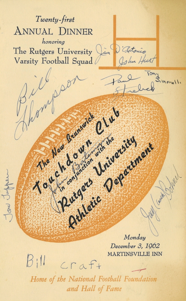 21st Annual Dinner Honoring the Rutgers University Varsity Football Squad. Presented by the New Brunswick Touchdown Club and the Rutgers University Athletic Department. December 3, 1962