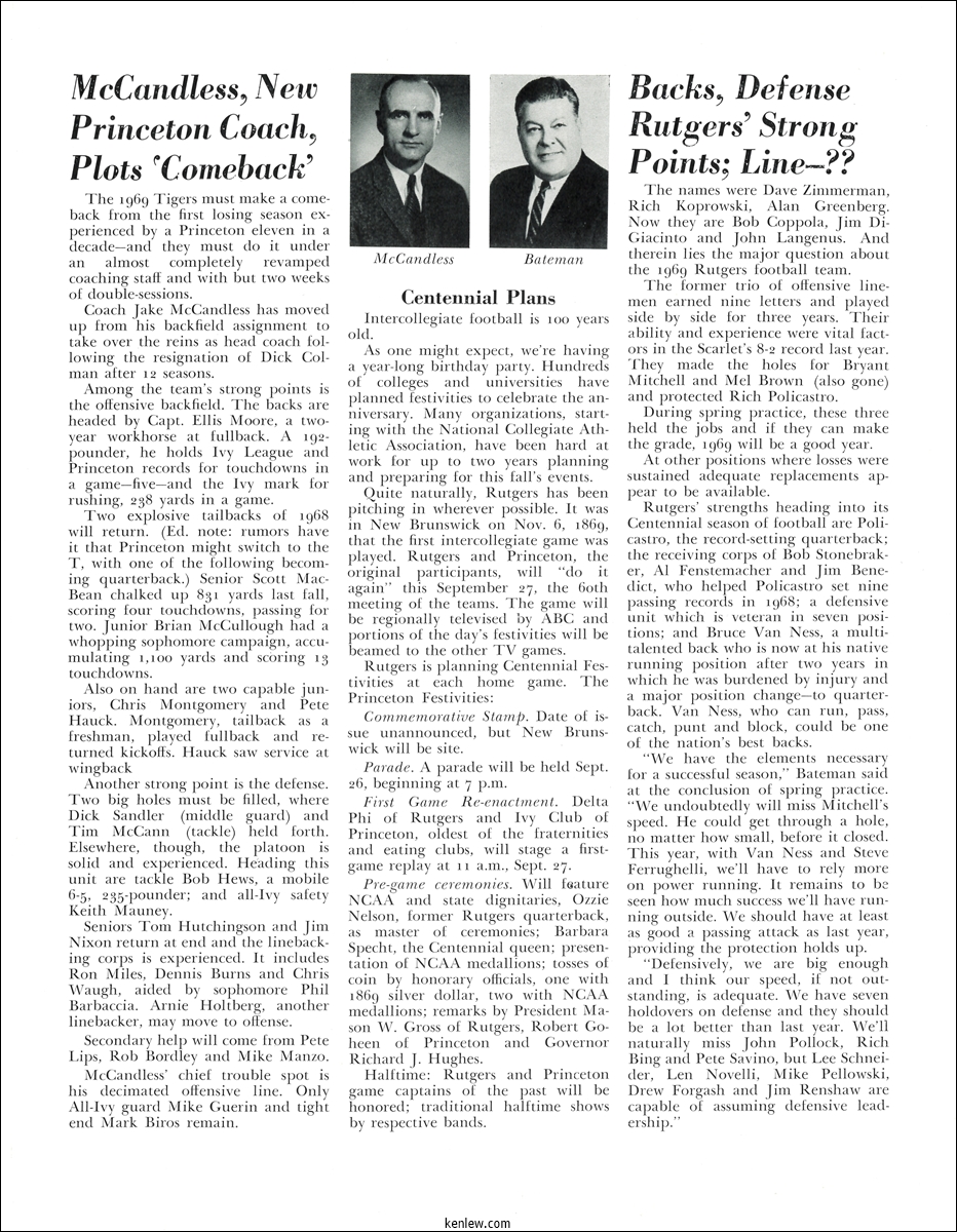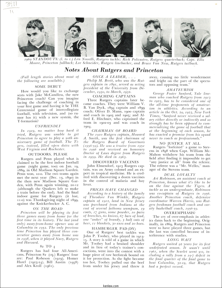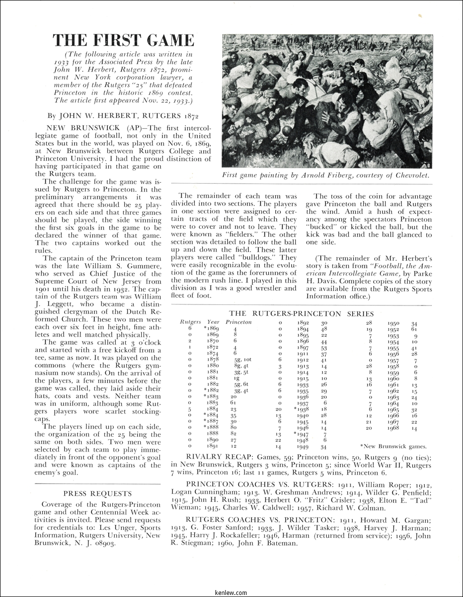 College Football's Centennial Game. Rutgers vs. Princeton September 27, 1969 on the site of the Original Game, Nov. 6, 1869
