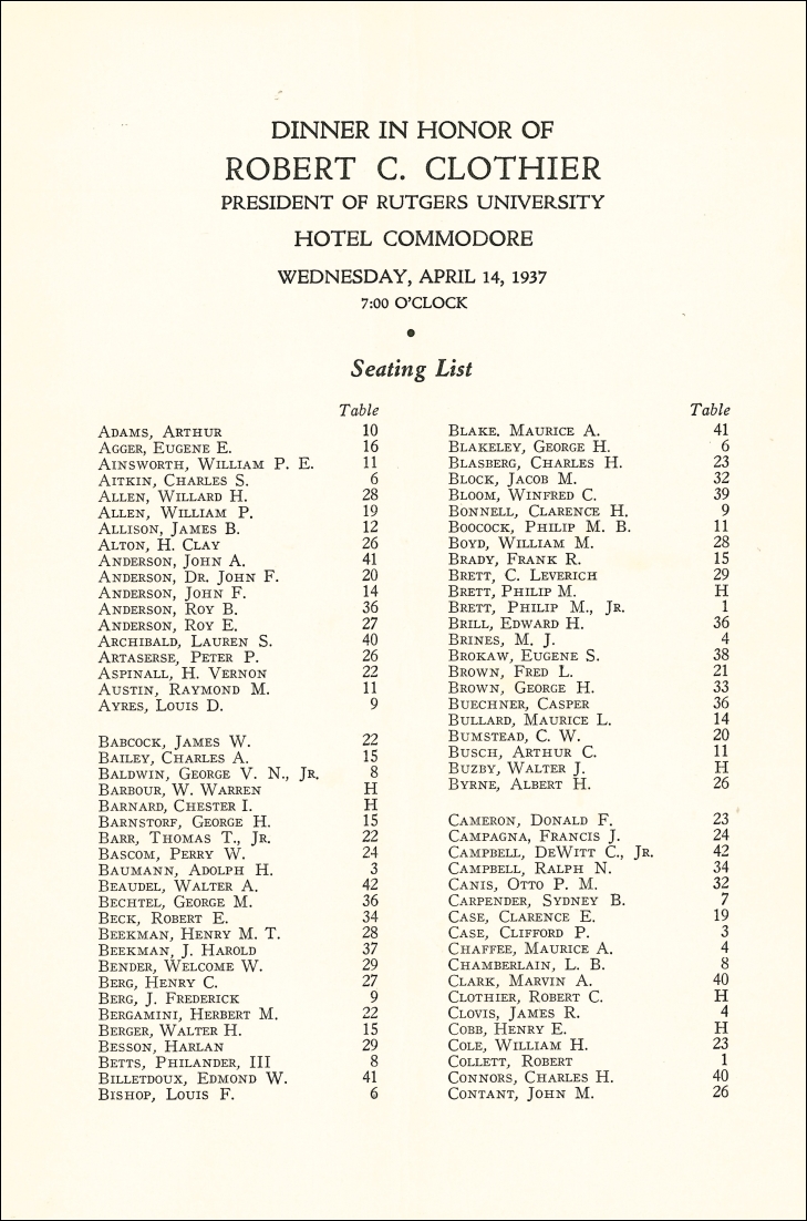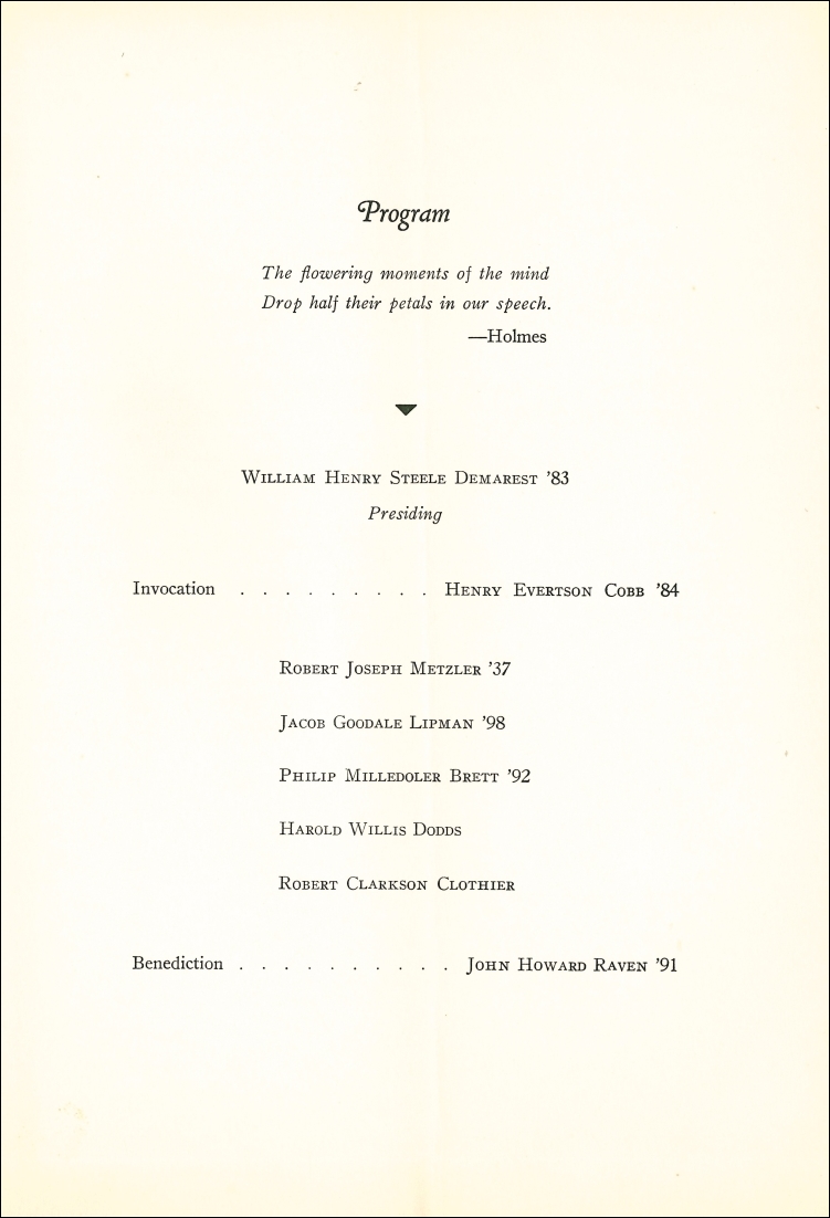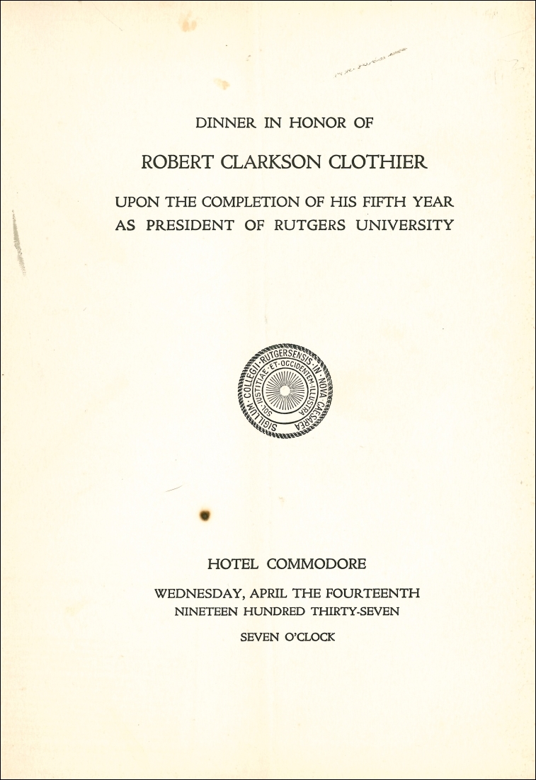 Dinner in Honor of Robert Clarkson Clothier Upon Completion of his Fifth Year as President.