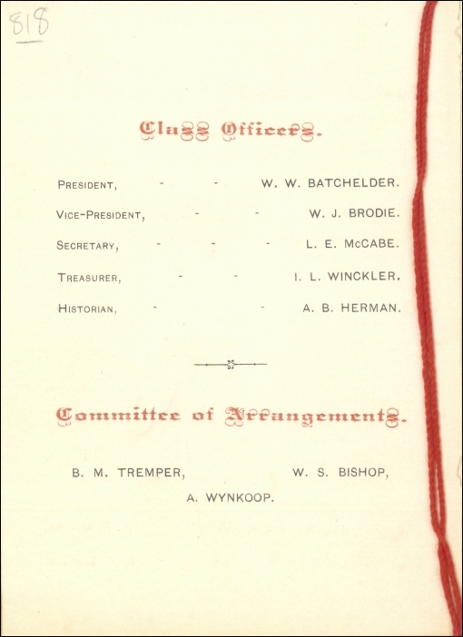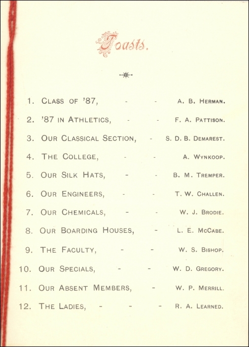 Rutgers College Class of 1887 Banquet. Friday, April 3, 1885