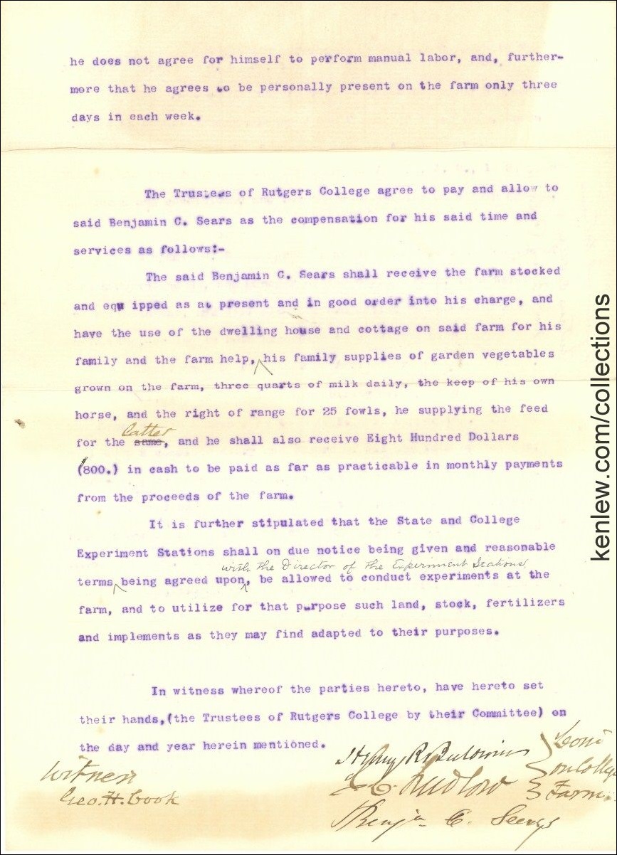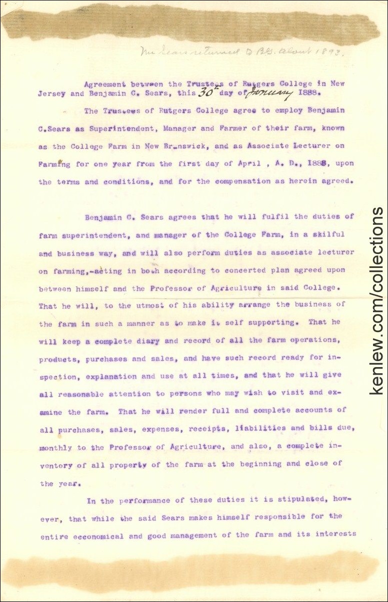 Agreement between the Trustees of Rutgers College in New Jersey and Benjamin Sears. 1888