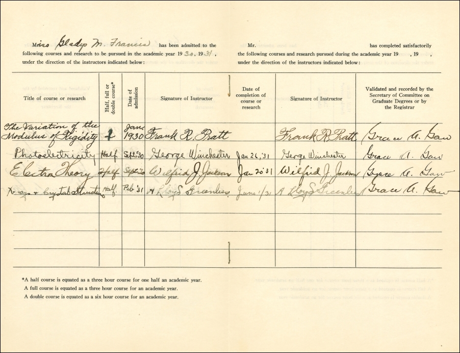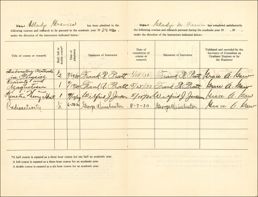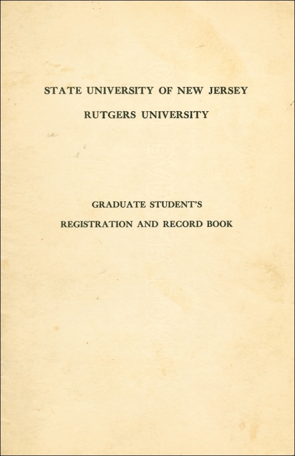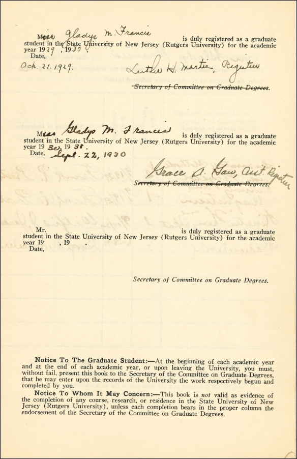 Rutgers University Graduate Students Registration and Record Book. Gladys May Francis, NJC Class of 1929