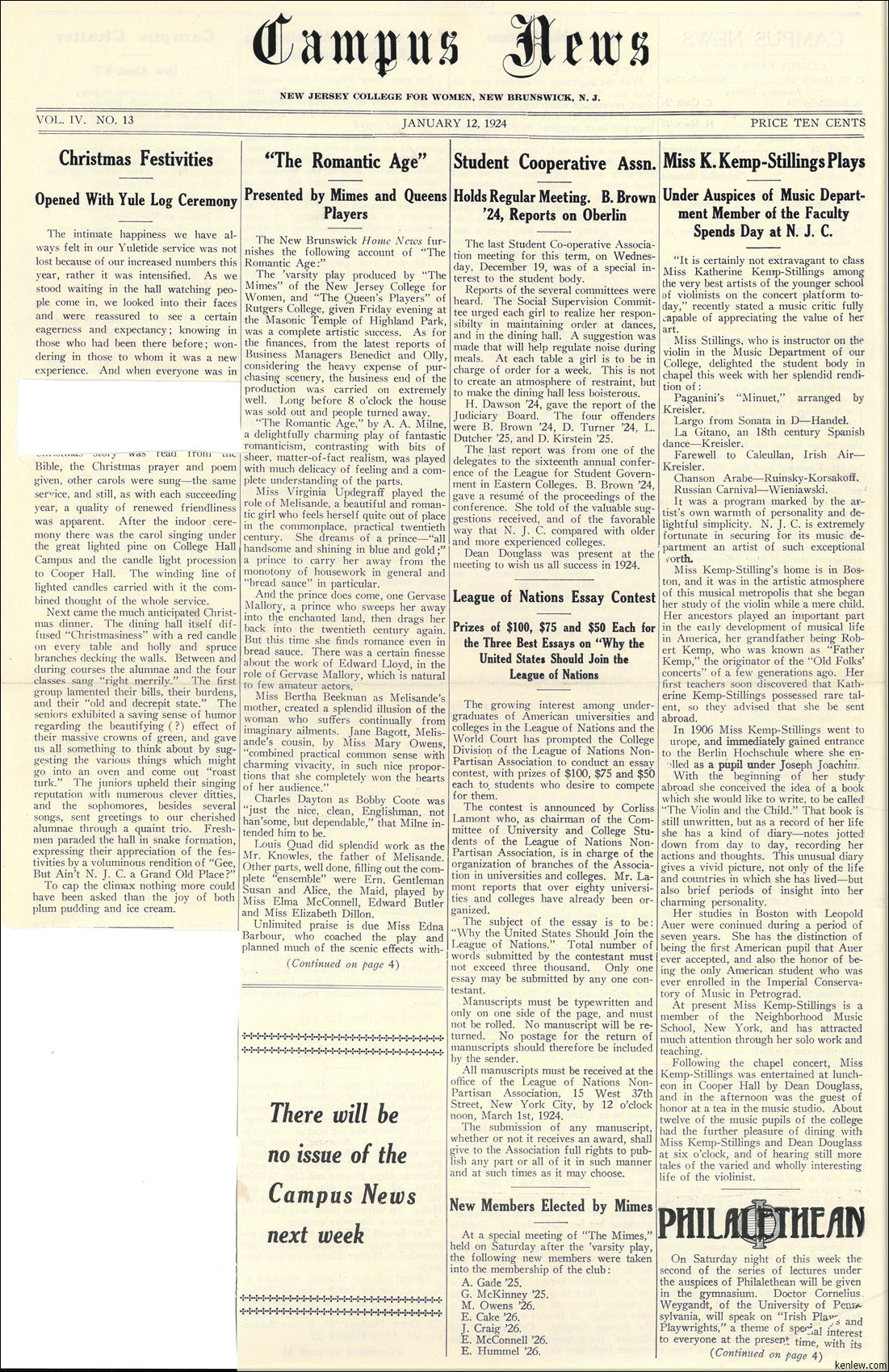 Campus News. Vol.04, No.13. January 12, 1924